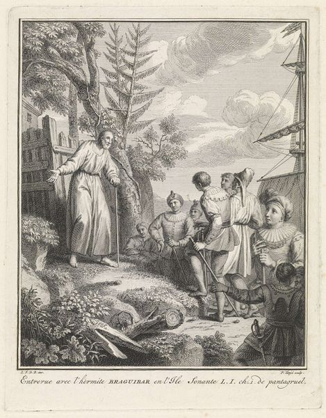 Curator: This engraving by Jan Caspar Philips, created around 1727, is titled "Kleding van de Khoikhoi," or "Clothing of the Khoikhoi." Editor: It has an almost stark quality. The figures stand out against a rudimentary landscape—their expressions, even in the print, are incredibly engaging, as are their costumes. There is an unmistakable element of depiction on display. Curator: Indeed, the clothing is the focus. Philips likely aimed to document the traditional garments. Note the use of beads, the capes draped across their shoulders, and those coiled anklets. This visual record then gains symbolic importance. Editor: This “record” also operates as a colonial gaze. How are the people positioned? And what is the social and power dynamic communicated? This becomes visible when their posture is juxtaposed with that of the background figures that seem to be almost crouching. This imagery has the capacity to communicate otherness, doesn’t it? Curator: It absolutely does. We should ask: what collective visual memories does this then tap into, consciously or unconsciously? The artist's composition creates a dynamic through contrast. Philips certainly wasn't a neutral observer; what were his intentions when crafting this narrative of "otherness?" How were they meant to read it? Editor: And importantly: who was his audience? Understanding the social context reveals the broader intersectional narrative. What purpose did these kinds of images serve during that time? Were they circulated, studied and discussed, shaping perception? It's less about pure anthropology and more about solidifying a political, racial hierarchy through images, no? Curator: Undoubtedly. The print underscores not merely cultural depiction but power structures operating through visual representation. The garments are no longer neutral elements but instead become elements embedded within a colonial visual archive. The image then works as more than merely a documentary tool. Editor: Looking closely, you realize the artist has set up various layers: dress as emblem, setting as backdrop and both intertwined into a staged social encounter. Recognizing the political dynamics at play helps unpack how images continue to affect our own readings. Curator: That's so very critical: recognizing and decoding those colonial scripts imbedded into images. Understanding how a single engraving taps into complex stories of cultural contact remains vital. Editor: The discussion that ensues should involve unraveling this entanglement—an important step toward building equitable, decolonized modes of spectatorship in how we approach art.