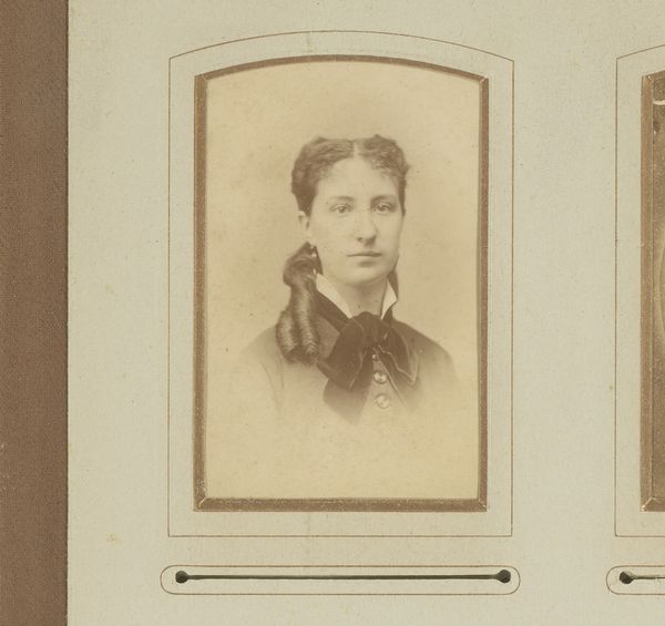 Curator: This gelatin silver print, titled "Portret van een vrouw met halsketting"—"Portrait of a Woman with Necklace"—likely dates from somewhere between 1858 and 1890, and its artist goes by the moniker A. Bõeseken. It really is quite remarkable. Editor: Yes, its affect is subtle but potent. A cool reserve emanates from the subject—a hint of melancholy perhaps—and there is a stillness about her gaze that draws me in. I want to know her story. Curator: Her composition is carefully orchestrated—the central framing, soft gradation of tones, and delicate details create an immediate sense of balance and formality. The curve of the frame complements her tightly wound braided coiffure. Editor: Precisely. It speaks volumes about societal constraints and the limited agency women possessed during the Victorian era. That elaborate necklace—almost like a barrier—draws attention to the throat, obscuring potential self-expression, literally and metaphorically cutting off her voice. Curator: Yet, there’s also a quiet defiance, a determined dignity radiating from her. The faint glint of the pearl earring, that solitary point of illumination—it creates a compelling dynamic with the heavy necklace. It prevents complete resignation, no? Editor: Absolutely. That very light draws me back to that quiet resilience you noted. Perhaps that ornament signifies quiet affluence or merely aspiration. There is something quietly provocative at play behind those eyes; an intimate look, that invites one to participate, but not to consume. Curator: Ultimately, this is a very intimate encounter made possible by photographic portraiture. It transforms the viewer into a privileged witness, allowing them entry into this woman's carefully constructed world, albeit for a fleeting moment. Editor: Precisely. I agree wholeheartedly, it is a small gem of quiet perseverance, an intimate invitation into the world of someone who, though captured by the conventions of her time, still manages to claim a certain measure of autonomy through her presence.