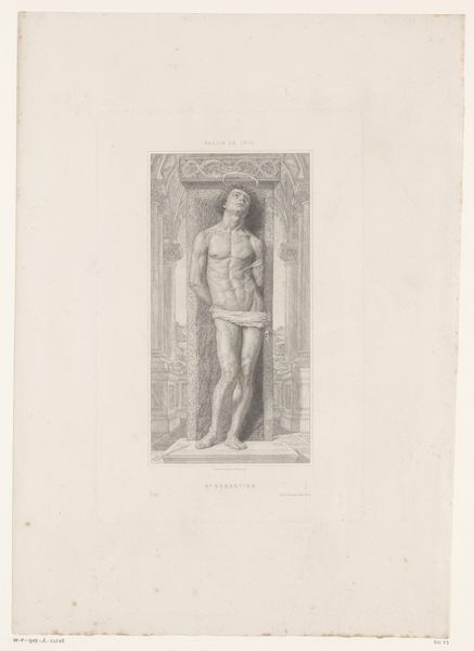 Curator: Let’s turn our attention now to Ferdinand Gaillard's "Saint Sebastian," currently residing here at the Harvard Art Museums. Editor: There's a vulnerability in this depiction. It's not just the physical exposure but a tenderness that feels almost confrontational. Curator: Gaillard's mastery of engraving is evident; it’s a celebration of line and tone. I'm struck by the intricate detail in the architectural setting, a beautiful counterpoint to the human form. Editor: The labor, the time, to create such detail! This wasn't just art; it was a testament to the engraver's skill, a kind of material devotion to craft. Curator: Indeed. It's interesting how Saint Sebastian, so often portrayed in agony, here seems almost serene, accepting his fate. What do you take away from it? Editor: A recognition of the sheer effort, the physicality of making art. And a somber reflection on how labor and suffering are forever intertwined, both in art and in life.