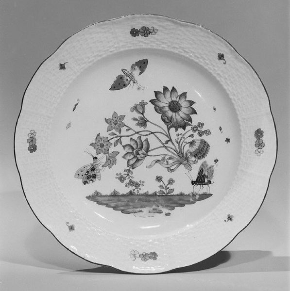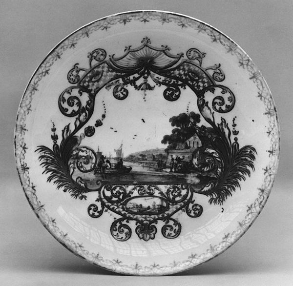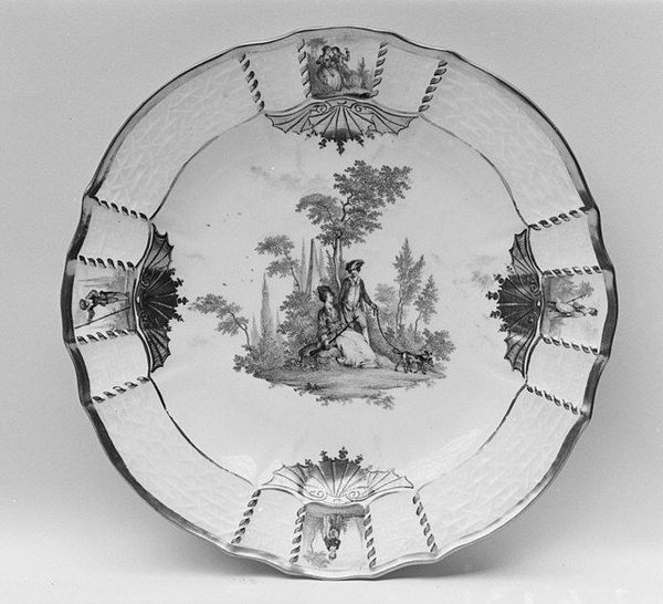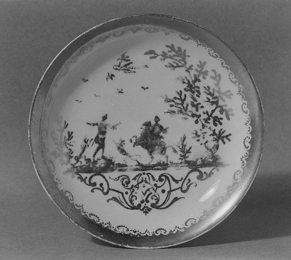 This plate was created by an artist on the rue de Popincourt. We see a scene painted onto its center. It's an interior scene, with a man in a military uniform on horseback seemingly abducting a woman. Such an image created on a plate implies the existence of a diner who appreciated military power. Given the man’s uniform, this plate was likely produced in France. At the time of its production, there were strong political divisions between those who supported the monarchy and those who embraced the French Revolution. As a result, there was also considerable social and political instability. Understanding that the image on this plate would have been highly legible to contemporary viewers, it raises the question of whether the plate's owner was a monarchist or an advocate for change. Careful research into similar plates and historical accounts would help to understand the social context of this piece.