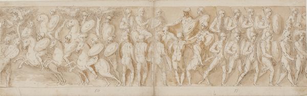 Curator: Let's take a look at "Building," a striking drawing by Cesare Nebbia, created sometime between 1536 and 1614. Editor: It gives me the impression of monumental labor, all captured in this faded, almost ethereal sepia tone. I am struck by the number of men involved, the variety of their poses, and the sheer physicality. It's… chaotic, almost. Curator: Nebbia was known for his ceiling decorations in Roman churches, and this piece offers us insight into the visual culture of construction. Notice the figures carrying blocks—symbols of collective effort and aspiration in many cultures—all orchestrated by someone of rank. Editor: You can certainly see the hierarchy being visually enforced here. There’s the figure in armor seemingly directing operations while other men visibly toil, lifting stones. How might their respective burdens of power be understood? The man's authority depends entirely on their efforts, and perhaps his own design limits his own creativity by directing theirs? Curator: The architectural drawing that the main figure is gesturing towards certainly implies that. We often see buildings representing social order, stability and shared values, the plan laid out for all to follow, while they’re left hauling heavy burdens in service of it. Editor: The men carrying materials—one on a ladder—become stand-ins, embodiments of a whole workforce relegated to the foundations. The Renaissance project of 'building' a new society really had uneven costs, visible here even through idealized bodies. The fact that they’re undressed adds to it –they symbolize something ancient, timeless labor, bodies exposed for building. Curator: It could be seen as allegorical too – perhaps a study representing the arduous construction of the Church. Note the classical references: the armor, the dynamic poses which suggests he may be nodding to Roman architectural imagery in its own right. Editor: True, these references create layers; simultaneously recalling the glory of Rome and the exploitation inherent in those projects. Nebbia seems aware of that dualism and I'm particularly stuck by the ways historical tropes about laborers end up shaping his aesthetic choices. Curator: Indeed, a visual reminder that even in grand achievements, individual stories and realities may be hidden, but it remains critical to acknowledge them nonetheless. Editor: I think, ultimately, Nebbia makes us think not only about what it means to build a structure, but what societal elements are forgotten along the way.