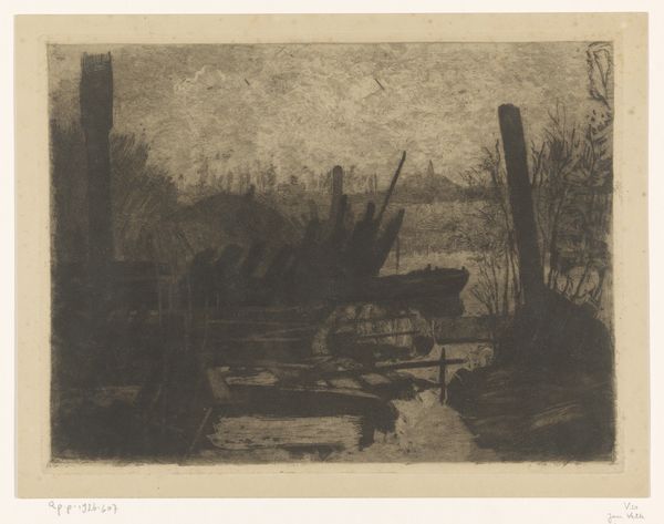 Frans Hens made this etching of a boat along the shore of a lake in Belgium sometime in the late 19th or early 20th century. This was a period when artists were increasingly turning their attention to scenes of everyday life and the natural world. Hens was associated with the artists' colony of Wechelderzande, part of a broader European phenomenon of artists seeking refuge from urban life in rural settings. These colonies often fostered a sense of community and experimentation, as artists explored new ways of representing the world around them. This image might reflect a nostalgic view of rural life. The scene is very peaceful, with no sense of the political or industrial changes that were rapidly transforming Belgium at the time. To understand this work more fully, we might want to research the history of artists' colonies in Belgium and the role they played in shaping modern art. We could also investigate the social and economic conditions of rural life in Belgium at the time, and consider how Hens's work may have reflected or challenged those conditions.