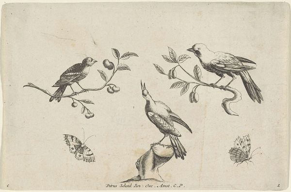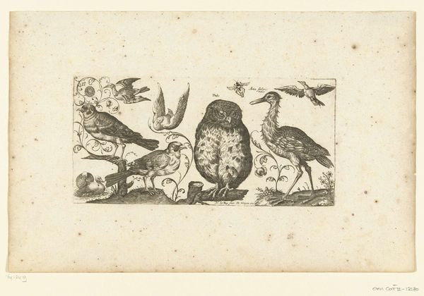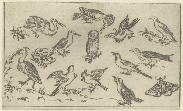 This is "Allerlei vogels" by Giacomo Franco, created around the late 16th to early 17th century using engraving. The print presents an array of birds, each meticulously rendered, scattered across the composition. The density of the cross-hatching creates variations in tone and form that both define and animate each bird. The linear precision captures each bird with scientific accuracy, yet they are arranged in a manner that transcends mere ornithological documentation. The organization lacks a traditional hierarchy, which suggests a more democratic, encyclopedic approach to the natural world. The absence of a clear background further flattens the image, emphasizing the graphic quality of the lines against the blank paper. Franco’s technique elevates the image to a study of form, function, and the very act of visual representation. This destabilization of established visual orders invites viewers to reconsider fixed meanings, to ask: how do we categorize and understand our world through images?