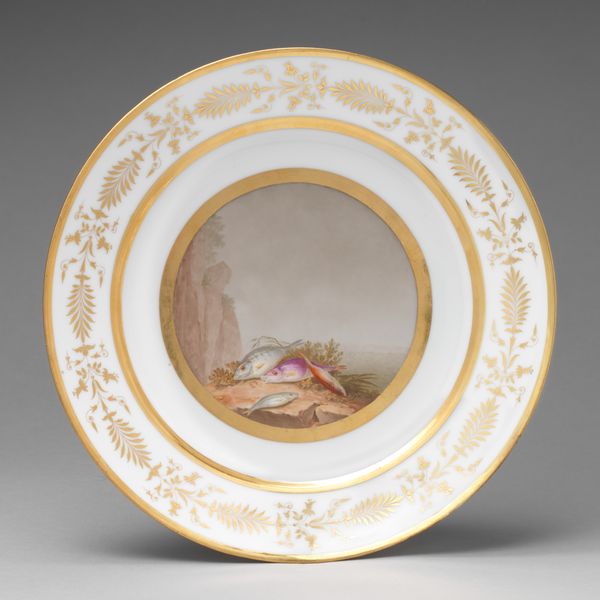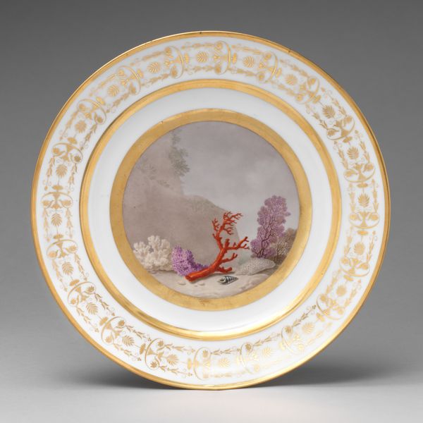 Editor: This is a "Dinner Plate" created sometime between 1800 and 1815 by Dihl et Guérhard. It’s earthenware and part of the decorative arts. I find the neutral palette elegant, but also subdued. What do you make of this piece, in its historical context? Curator: Well, immediately, the Neoclassical aesthetic comes to mind. It’s fascinating how objects like this dinner plate reveal the socio-political leanings of the time. The motifs—what do you notice about them? They seem more than just decorative, don't they? Editor: They do. There's a flag and some leafy branches in the center, and then other motifs along the rim – some weaponry maybe? Curator: Exactly! Think about the period. Post-French Revolution, Napoleonic era. Neoclassicism wasn't just an aesthetic preference, it was intertwined with ideas of civic virtue, order, and even imperial power. A dinner plate, like this one, became a stage for communicating such ideals. What impact do you think placing imagery of power and patriotism on everyday objects like this had on the consumer? Editor: It normalizes it? Almost like subliminal messaging in dining. It subtly reinforces those ideals. It's no longer confined to grand paintings in museums but part of domestic life. I'd be interested in seeing what foods were typically served on this dinner plate... Curator: Precisely! It all contributed to constructing a certain identity, both personal and national. And think about the patrons – who was consuming this imagery, both literally and figuratively? It wasn’t the common folk, it was a form of conspicuous consumption. Editor: This has totally changed how I see decorative art. I mean, I wouldn't have thought about how this plate reflected larger power dynamics, so that's super interesting! Curator: Right? Objects like this, often overlooked in favor of "high art," offer a powerful lens through which to examine social and cultural history.