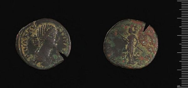 Curator: This is a sestertius of Julia Mamaea. It's a bronze coin, a tangible connection to the Roman Empire. Editor: Immediately, I'm struck by how worn it is, yet the image remains. It speaks to survival, doesn't it? Curator: Absolutely. The portrait of Julia Mamaea, mother of Emperor Severus Alexander, embodies power and matriarchal influence. Her image, preserved on currency, reinforces that power. Editor: The coin also served as propaganda, reinforcing social hierarchies of Roman society in which gender was a key factor. Curator: Indeed, and the figure on the reverse likely has symbolic meaning. This layering of symbols invites deeper reflection on the historical and cultural context. Editor: Seeing this coin bridges a gap. It reminds us that history isn't just dates and names, it's also about daily life, power, and how societies construct meaning. Curator: Precisely, symbols and their context continue to influence us today. Editor: And by critically examining these artifacts, we can unpack those influences.