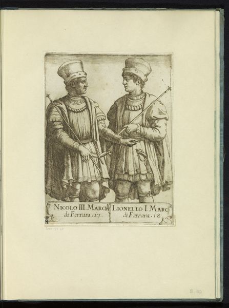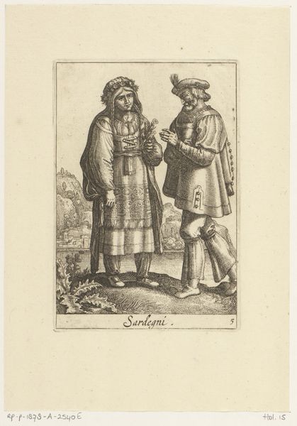 This is an anonymous etching depicting a man and woman in traditional Frisian attire. The eye is immediately drawn to the intricate detailing of their clothing, rendered with a precision that speaks to the engraver's skill. Note the repetition of circular motifs and the vertical lines that elongate the figures, creating a sense of formality. The composition, while seemingly straightforward, reveals a deeper engagement with cultural codes. The attire signifies identity and status, embedding the figures within a specific social framework. The artist employs line and pattern not merely as decoration, but as a semiotic system, communicating values and traditions. Consider how the structured arrangement of elements invites us to decode the visual cues of dress and posture. This image offers a glimpse into the past and a reflection on how culture is constructed through visual representation.