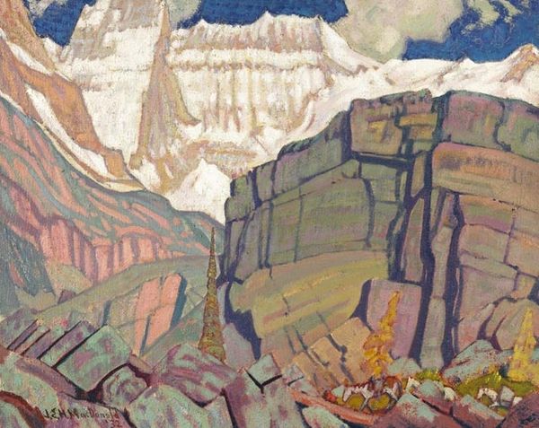 Editor: This is "Grand Canyon", a print made by Louie H. Ewing around the 1940s. I’m struck by its stylized simplification of a landscape, almost bordering on abstraction. What aspects of its visual composition stand out to you? Curator: The colour palette is particularly interesting. Note how the artist employs a limited range of tones— muted blues, greens, and pinks — to create a harmonious, if somewhat unreal, portrayal. Consider, too, the use of flattened forms. How does this contribute to our perception of space within the artwork? Editor: I think it makes the vastness of the Grand Canyon seem almost contained, like a series of stacked blocks. The sharp delineation of the shadows also creates a sense of depth, even if it is somewhat artificial. Curator: Precisely. The sharp, unwavering lines outlining each form underscore the two-dimensionality, working against a complete illusion of depth. We can almost "read" the landscape as a sequence of flat shapes arranged upon a single plane. How do the shapes contribute to a sense of order? Editor: Well, there’s a clear structure with horizontal bands creating the sky, the canyon walls, and the treeline. I guess, the composition offers us a structured interpretation of nature. Curator: Yes, note how the structure prioritizes order over realistic representation. Consider how the use of color and geometric simplification come together to achieve something unique and thought-provoking, don't you agree? Editor: Absolutely! I hadn’t considered how the interplay between flattened forms and colour contribute to the unique perspective of this landscape.
