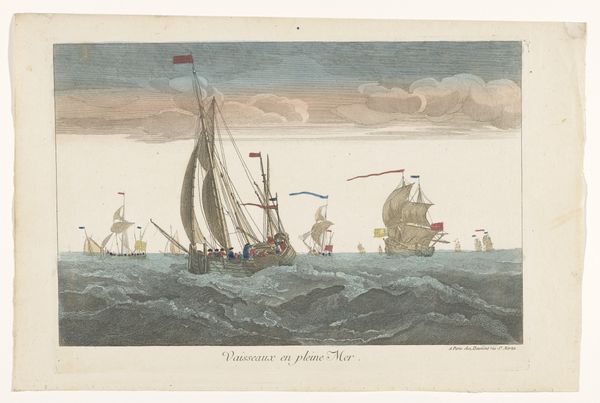 Jean-François Daumont created this print, *Zeegezicht met schepen en boten in de wind*, sometime before his death in 1775, using etching and hand-coloring. These were relatively accessible printmaking methods, allowing for wide distribution. Look closely, and you'll see that the etching process has given the image a linear quality, like a pen-and-ink drawing. The lines create the illusion of form and texture, from the choppy waves to the sails billowing in the wind. Hand-coloring adds another layer of detail, enlivening the scene with red and blue flags, and creamy sails. The ships themselves are evidence of significant labor, both in their construction and operation. Each vessel represents an enormous investment of resources, from raw materials to skilled craftsmanship. The print, then, is not just a pretty picture, it's also a record of maritime activity, and the complex social and economic systems that supported it. By focusing on the materials, techniques, and historical context of this print, we can move beyond traditional art historical categories and see it as a fascinating artifact of its time.