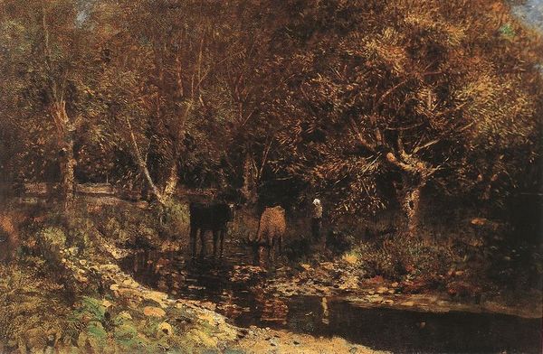 Curator: This is "Grazing" an oil on canvas by Efim Volkov. Volkov was a Russian landscape painter known for his evocative scenes of rural life. Editor: My first impression is how evocative the light is here, breaking through the dense trees to illuminate the figures. It’s like a fleeting moment captured in paint, hinting at a narrative beyond what we immediately see. Curator: Indeed. This painting is characteristic of the late 19th-century interest in peasant life and the idealization of rural existence, though that view was also deeply entrenched in ideas around Russian nationalism. What do you see in terms of symbolism? Editor: The cow is prominent and imposing, which in agrarian societies often signals prosperity and domesticity. The sheep follow meekly. A woman shepherds them all; the arrangement, therefore, isn’t just picturesque. It suggests her relationship to both animals and the land, and the cyclical nature of existence itself. Curator: Yes, but let's not forget how carefully these images are curated for a growing urban audience interested in romanticizing the countryside, even though life for rural people remained difficult at that time. Notice how softened the light is and how picturesque it all appears: there is nothing harsh or realistic in the presentation here. Editor: I agree that the softer palette serves to enhance a comforting scene, and I see the composition also evokes a sense of timelessness—of something persistent through generations, a symbol of cultural identity that resonated with urban populations undergoing modernization. Curator: We should also acknowledge that Volkov was associated with the Peredvizhniki movement—artists who wanted to take art out of the elite salons and show it to the people, though still within the dominant modes of representation of that time, of course. Editor: Ultimately, though, I think it still communicates a powerful connection to nature—one where humans, animals, and the landscape exist in delicate harmony. Curator: That tension between idyllic vision and historical reality makes it so compelling. Editor: Precisely. A painted echo of an era—real or imagined.