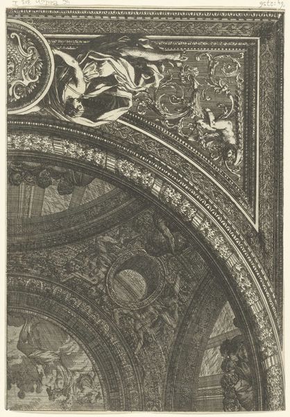 Curator: Soaring above us is Alfred Stevens' "Design in Perspective for the Decoration of a Vaulted Corridor," part of the Tate Collections. The support measures 321 by 470 millimeters. Editor: Whoa, it's like a blueprint for a dream, isn't it? All these swirling patterns and figures... Makes me want to lie on the floor and just stare upwards for hours. Curator: Stevens was deeply influenced by the Italian Renaissance. This design reflects the grandeur of spaces intended to impress and inspire, typical of the period. Editor: I love the little glimpses of blue amidst the ornate carvings – a touch of the heavens peeking through. Almost feels like sacred geometry in motion. Curator: Indeed. These vaulted corridors often served as transitional spaces, shaping the experience of those moving through them, directing their gaze and influencing their perceptions of power and status. Editor: It's kind of wild to think this was never fully realized, but remains a sketch, a whisper of unrealized potential. Still makes quite a statement, though, doesn't it? Curator: Absolutely. It showcases Stevens' skill and offers valuable insight into the design aesthetics of his time. Editor: Well, I’m definitely feeling more inspired after looking at this. Time to go create my own vaulted dreamscape.
