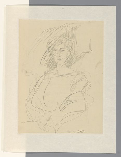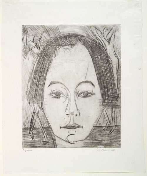 Otto Mueller created this print, Brustbild Maschka II, using a drypoint technique, which gives it a direct, almost scratchy feel. The limited palette focuses on blacks and grays, lending a sense of intimacy to the portrait. It's like Mueller's process becomes part of the subject. Looking closely, you can see how the texture isn’t just on the surface; it's built into the very image of Maschka. See the way the lines around her eyes are etched? There's a delicate balance between revealing and concealing, which makes me think about the push and pull in all of our relationships. The background is full of scratchy marks that suggest a location without describing it. I think of Paula Modersohn-Becker and her portraits of women when I look at this print. Like her, Mueller isn't trying to give us a perfect picture, but rather capture something essential, something human. It's a reminder that art doesn't have to be polished to be powerful.