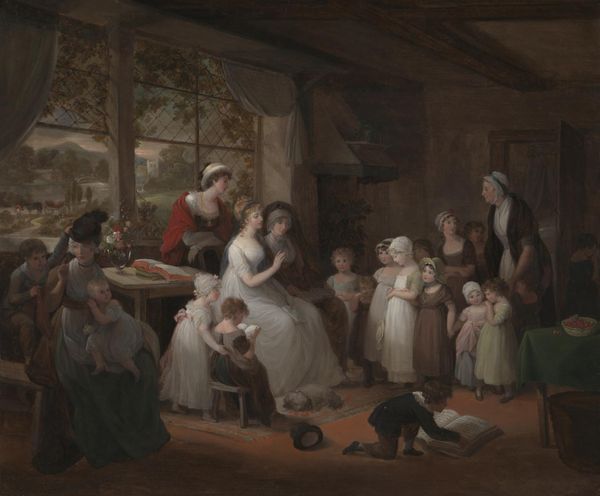 Curator: This canvas, residing here at the Rijksmuseum, is called "Historical Scene with William the Silent?" and was crafted with oil paint sometime between 1830 and 1860 by Nicolaas Pieneman. It has a rather murky quality about it. Editor: Yes, immediately striking is that muted palette—mostly browns and creams. It gives the scene a certain hushed, perhaps even somber, tone. You can almost smell the beeswax polish on the furniture. The lighting seems intentional as if he focused his energy primarily on rendering form rather than a scene bathed in color and sunlight. Curator: Precisely, it is an exercise in restraint! And given Pieneman's background, that focus on material detail isn't surprising. Consider the romanticist brushwork versus the smooth rendering of a dress, and you start to realize that everything is carefully curated by the artist. A little dog frolicking...how does it all come together? Editor: Absolutely! The brushwork dances on a razor's edge between evocative suggestion and almost careless execution, which for me, heightens its intriguing nature. Did he deliberately choose rough materials and apply these thin layers of color in order to give a material effect which mirrored historical preservation and process? And I think, the 'careless strokes' bring a raw intensity. It speaks volumes of Romanticism at that time. Curator: You see right through the artifice! Though one does have to acknowledge his attention to detail like in the subtle gleam on what seems to be a satin dress, a tiny moment of grandeur. Yet those charcoal renderings in the background, not even finished or framed as one might expect! It really begs one to question what story he really wished to reveal or conceal from our sight? Editor: He really balances the personal narrative with the power and the grandeur of "history painting," doesn’t he? So is it about William himself or about the act of history making, which often involves more than just the central hero? Maybe the artist's choice of those materials and careful depiction represents a more nuanced interpretation of labor, legacy, and power in making the history itself? Curator: It certainly feels like Pieneman intentionally leaves us grappling with those ambiguities! I feel strangely invited to enter this world in the shadows; and the quiet drama somehow amplifies this artwork. Editor: Exactly. The painting seems simple on first glance; however, if you slow down for just a moment, it slowly peels away and whispers a bit about Romanticism with muted intensity of materiality during the Dutch Golden Age. It's all quietly powerful.