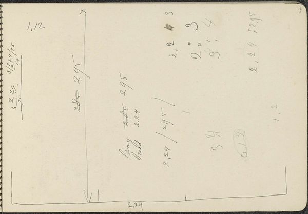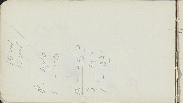 Editor: This is "Getallen," which translates to "Numbers," a drawing from 1893 by George Hendrik Breitner, residing at the Rijksmuseum. It's rendered with ink, pencil, and pastel on paper, with a definite aged look to it. There’s something intimate about seeing what appears to be calculations within the lines of a grid. How do you read a piece like this? Curator: Well, considering the materials - ink, pencil, and pastel – tell us Breitner likely created this work rapidly and informally, maybe as a functional exploration of numerical ideas in a notebook. The aged paper speaks to the very tangible processes that define artmaking, resisting purely conceptual understandings of his art. What meaning might you extract from this relationship? Editor: So it’s less about the numbers themselves, and more about the process, the evidence of creation left behind, as if capturing labor through materiality? Curator: Exactly. Think about what sketchbooks signified in the 19th century - tools, commodities available on the market for an emergent urban bohemia. Breitner wasn't creating timeless beauty, but engaging in a daily, material engagement. That is part of its story too. It’s challenging the high/low art boundary isn't it? How does its presence within the Rijksmuseum shift that narrative, then? Editor: I suppose it forces a re-evaluation. Placing an everyday object—a working document—within this context elevates it while simultaneously grounding the more traditional artwork displayed alongside it. I hadn’t considered the social and material context that much. Curator: It also prompts consideration of artistic consumption – is this page "art" or is it data? Editor: It definitely adds a layer I was missing. Seeing art through the lens of materials and production opens up a new avenue for interpretation. Thanks! Curator: Indeed. It is rewarding to peel back those layers of production, isn’t it?