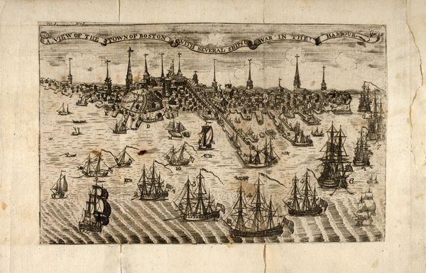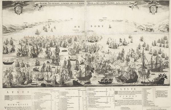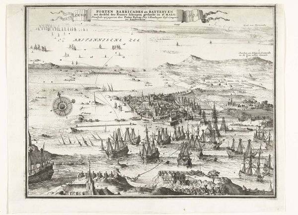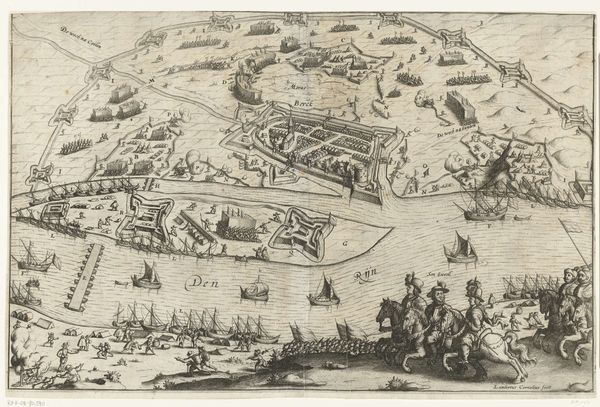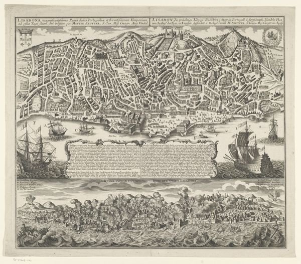 Curator: My first impression is wow. A dense, swirling hive, but with the promise of expansion... What about you? Editor: This is part of Balthasar Florisz. van Berckenrode’s map of Amsterdam, printed around 1625. Looking at this engraving, we aren’t just seeing a city; we’re seeing the engine of a burgeoning global power at the peak of the Dutch Golden Age. Curator: It feels almost aggressively geometric in places, then softens around the edges with these... whimsical waves? Like, "Here be dragons," but instead it's just regular ol' choppy waters. Editor: Absolutely. The precision with which the city’s layout is rendered—the rigid canals, the fortified walls—it's a testament to Dutch engineering prowess. But, this precision masks the underlying currents of colonialism and trade dominance that fueled that "Golden Age," what do you think? Curator: You see that text block nestled into the corner? I love imagining someone in the throes of a mid-17th-century real estate boom using it to navigate the canals. A modern-day street-view equivalent! But yeah, that geometric obsession can also seem dehumanizing in a way. Like each building, each person, reduced to a data point. Editor: Precisely. Maps like this aren't just neutral representations. They played a role in staking claims and solidifying power. Consider the positioning of Amsterdam, geographically blessed—or perhaps strategically violent—to intercept global trade routes and dominate economies around the globe. Each ship you see sailing freely into that harbor tells its own story. Curator: Ships are like, the period at the end of that long colonial sentence, right? So, with the knowledge that each sailing ship represents these voyages of colonization and economic power…Does that add another layer of complexity to this image? Editor: It does. Seeing the meticulous detail in the ships and docks…one has to recall that this entire enterprise depended on exploited labor, the trade in enslaved peoples. Even the paper this print is etched on likely passed through such hands at some point, too. Curator: Hmm, perhaps my whimsical interpretation was too glib! I’ll consider this from now on when I encounter cityscapes. Thanks for this different look! Editor: Anytime! Remember that images never exist in a vacuum. Every picture whispers complex truths and power dynamics. The job for us now is to discern these subtle messages to reveal broader discussions.