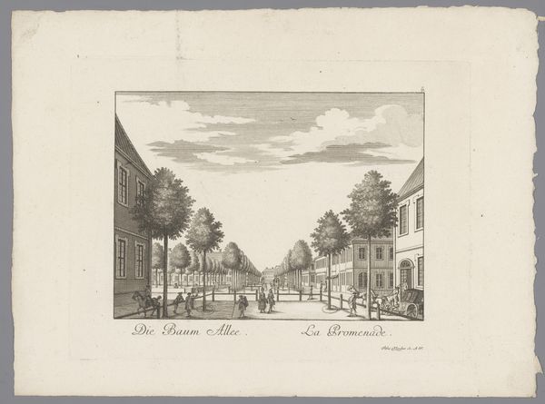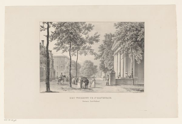 Curator: This subtle lithograph, etching, and print is titled “Gezicht op het Korte Voorhout te 's-Gravenhage", offering a glimpse of The Hague between 1840 and 1860, captured by an anonymous artist. What’s your first impression? Editor: It's bathed in this soft, almost melancholy light. A quiet stillness permeates the scene; it's the sort of image that whispers stories of times long past. I'm struck by how everyday and ethereal the two blend so seamlessly. Curator: Absolutely, it possesses a unique charm, capturing the mundane within an airy and picturesque presentation. Thinking about the work itself as an object—a print created through both lithography and etching techniques, produced mechanically and consumed widely—complicates the "realism" apparent within the cityscape, doesn't it? Editor: Yes, it highlights how labor, material conditions and distribution can shape artistic representation. You can almost hear the stones scraping and the etching tools marking; the anonymous hands that crafted this vision for mass consumption...Were these made to sell to locals, tourists, or for someone entirely different? Curator: It would likely have served multiple purposes. Souvenir, documentary, or even aspirational view of civic life. Considering the combined etching and lithographic processes, it's intriguing how the artist balanced detail with efficiency to produce these for the market. Did the materiality serve to invite an imagined and more refined version of their material and everyday existence? Editor: That's it precisely, I find the print a fascinating lens through which we see not just a physical space but also the subtle class distinctions in representing such an ordinary public street. Who could buy this, who is missing from it, what is romanticized? Curator: These considerations provide layers of depth. A city street, crafted with industry and intention and speaking now to many aspects of society beyond what it immediately displays. It becomes, through technique, a mirror. Editor: Yes, and those processes invite me to consider not just what I’m seeing, but how— and ultimately, who made it so. The materiality really emphasizes that.