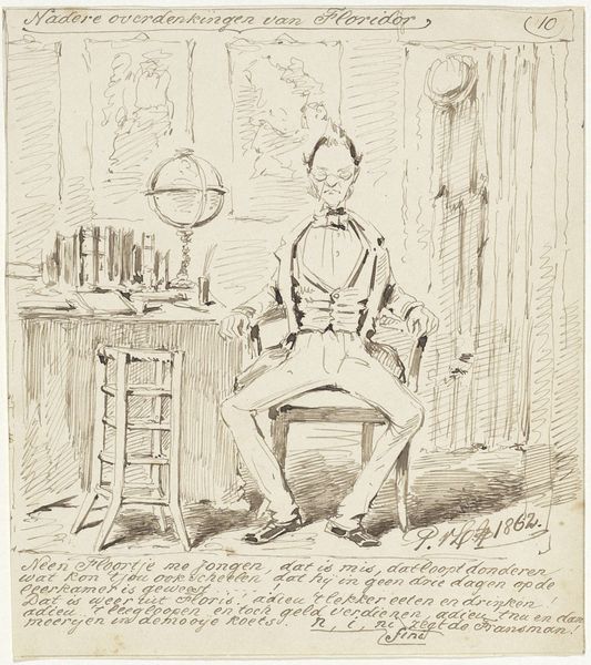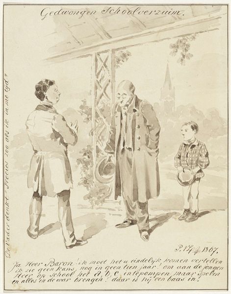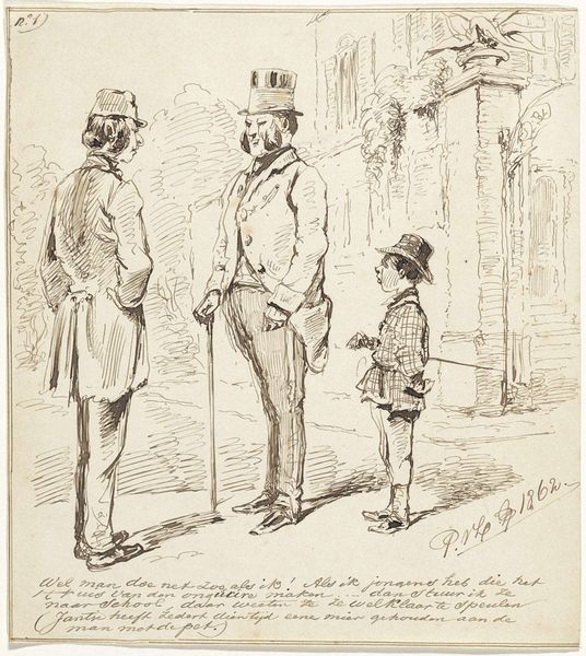 Editor: Here we have "Verhaal van de jongen Jantje," or "The Story of the Boy Jantje," a pen and ink drawing from around 1811-1873 by Pieter van Loon. I find the figures in the drawing quite intriguing, almost like a scene from a play. What do you see in this piece? Curator: It strikes me as a social commentary couched within Romantic aesthetics. Van Loon employs figuration within genre-painting to deliver narrative art with ink. It's important to consider the social strata depicted, wouldn’t you agree? Editor: Absolutely, I see different levels of wealth portrayed here, but it's like they’re caught in a moment. Do you think the story of “Jantje” is pointing out societal flaws, like class disparity, that were just under the surface? Curator: Precisely! Notice how the composition places the pensive figure at the table apart from the more animated discussion, symbolizing alienation perhaps, but also highlighting the constructed nature of leisure and privilege? Who has the privilege to contemplate? Where does labor exist in this drawing, beyond its own creation? Editor: I hadn’t thought of it that way. The drawing becomes more layered when we examine who’s allowed to pause and reflect, and who is destined to act in it. Thanks, I see it much clearer now as more than just a simple story of love, but one of societal structure. Curator: And hopefully, this exploration encourages us to ask those questions of the society we find ourselves in now!