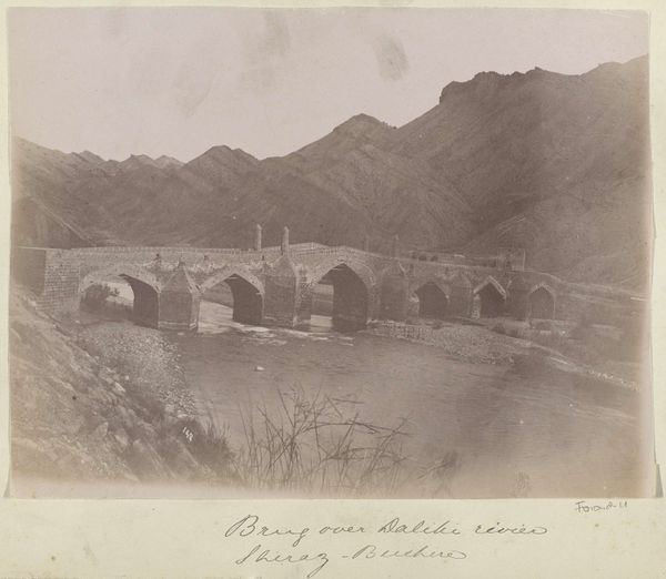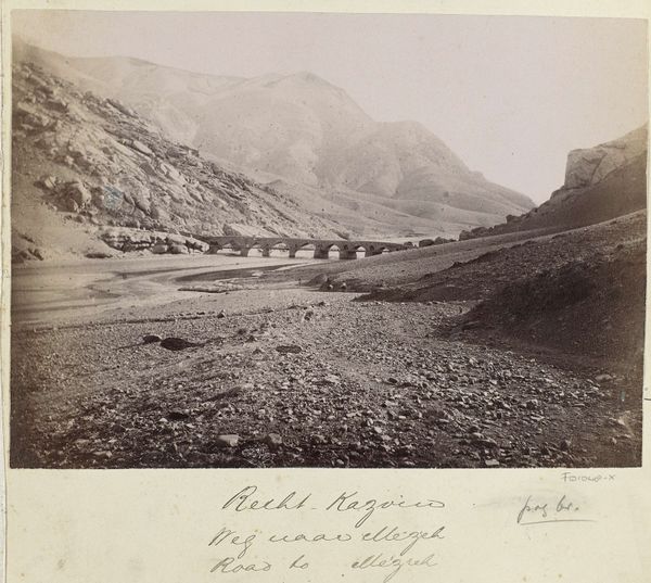 Editor: This is Samuel Bourne's photograph, "Bridge on the Ravi river near Chamba, Himachal Pradesh, India," taken between 1862 and 1864. The stark contrasts in tone and texture are really striking – the rugged rocks versus the man-made bridge. It's a glimpse into a very specific place and time. How do you interpret this photograph within its historical context? Curator: Well, consider the period. Bourne was working in India during the British Raj. This image isn't just a landscape; it's a carefully constructed representation of British ambition and exploration in a "foreign" land. The bridge itself is a symbol of that, isn't it? An attempt to exert control over nature, to connect disparate places. Editor: So the very act of documenting the landscape becomes a form of asserting power? Curator: Precisely. Think about who this photograph was intended for – likely a European audience, back home. It plays into the colonial narrative of bringing "progress" and "civilization" to India. Notice the small figures crossing the bridge. How are they dwarfed by the landscape and the structure itself? Editor: That’s a good point, it really does create a sense of scale. And the bridge does look rather imposing. Curator: It invites questions about whose perspective is centered here. What is included? And, more importantly, what's left out? Editor: So, it's less about the "natural" landscape and more about the colonial project? I never would have thought of it that way just by looking at it! Curator: Indeed. The photograph offers a romantic vision but obscures a complex history of power and representation. Thinking critically about that framing is key to understanding the artwork. Editor: I’ve never considered photography quite like that before. This opens a completely different way to view a seemingly simple image of a bridge!