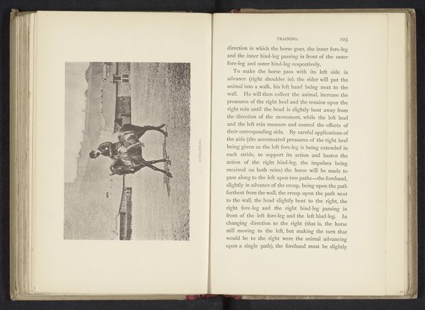 Curator: This intriguing photographic print, titled "Man op een paard in zijwaartse galop", or "Man on a horse in a sideways gallop," resides here at the Rijksmuseum and predates 1889. The piece intrigues us with its depiction of early equestrian training methods. Editor: Immediately, the image strikes me as still, yet in motion. The monochromatic palette gives it a timeless quality, almost like a drawing, despite being an early photograph. The diagonal composition imparts dynamism to the ostensibly still image. Curator: Indeed. Notice how the light catches the paper fibers and the tonality shifts subtly. These aesthetic choices serve to amplify the formal qualities of the image, underscoring the deliberate balance of the horse and rider's form against the negative space of the backdrop. Editor: From a material standpoint, it's also captivating. Look at the texture of the print, almost aged; the fibers of the paper on which it is captured—these highlight the means of image-making, grounding the elegant scene. Considering this was pre-mass media, the choices in capturing it speak to privilege and available time, no? Curator: Possibly. I find the linear elements and composition almost constructivist in their geometric harmony. There is also the implied symbolic dimension within. Think of the semiotics of posture: How do line, shape, tone, and position represent social relationships, discipline and mastery over nature? Editor: Perhaps. I would also look at the cost of photographic materials and print runs at the time. Labor must certainly also play a role as equestrian skills had to be captured for record or didactic purposes. What type of labor was considered acceptable to immortalize through an expensive new technology such as photography? Curator: Certainly points to further exploration, and this intersection of the equestrian and technological reveals the piece as not simply a depiction of a moment but rather, an intersection of cultural forces. Editor: It really gets one thinking about who and what get recorded for the ages, and why we memorialize the subjects that we do.