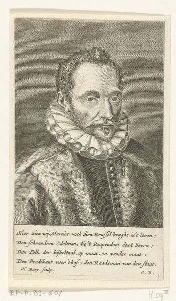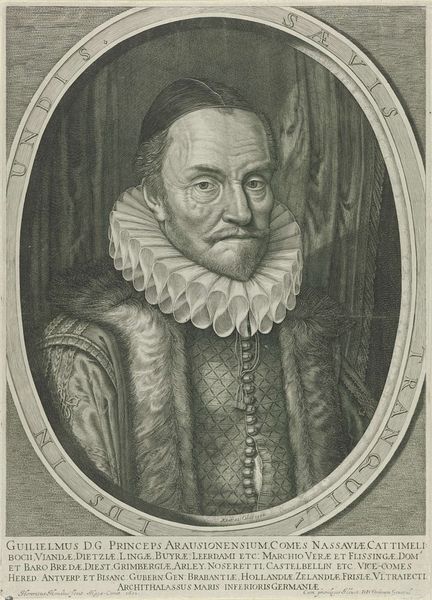 Editor: Here we have Hendrik Bary's "Portret van Willem I, prins van Oranje," an engraving from 1663 held at the Rijksmuseum. There's a striking intensity in William's gaze, made more stark by the detail achieved in the ruff and fur coat through the engraving process. What historical weight do you see in this image? Curator: This portrait isn't just a likeness; it's a carefully constructed piece of political iconography. The engraving medium itself is significant. Prints like these were mass-produced and widely distributed, playing a crucial role in shaping public perception of William of Orange. How do you think its dissemination influenced his image? Editor: I suppose having access to a printed image made him more familiar to more people and would solidify his place in people’s memory. Curator: Precisely. Consider also the Dutch Republic at this time: it was forging its national identity. Bary's work, by visually celebrating William, helps to define a national hero. It places William of Orange into a narrative of Dutch exceptionalism, one that resonates through the Baroque grandeur evident even in the engraved line. Is that something you notice, and does the poem at the bottom contribute to this? Editor: The inscription certainly adds to the feeling of reverence, celebrating his virtues. I see it. I didn’t even consider that prints can shape historical narratives; they aren’t just portraits. Curator: Exactly. Remember to examine how artistic representations actively participate in shaping and solidifying power dynamics within society. Think of prints like this as the social media of their day. Editor: This has totally shifted my perspective. I'll definitely look at prints with a new set of eyes now!