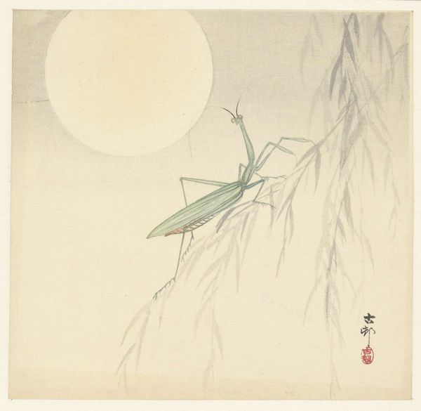 Ogata Gekko created this woodblock print called 'Full Moon and Autumn Flowers by the Stream', sometime between the late 19th and early 20th century. The composition immediately strikes us with its careful arrangement of shapes and forms, with the large orb of the moon dominating the upper right and the delicate branch of autumn flowers reaching across from the left. Note how Gekko uses muted colors to evoke a sense of tranquility and the cyclical nature of time. The overall structure of the print, with the moon's soft glow contrasting against the detailed floral arrangements, establishes a visual dialogue between the eternal and the ephemeral. Consider how the print engages with the semiotic system of signs and cultural codes which have been long informed by Japanese aesthetics. The moon often symbolizes enlightenment and the transient nature of beauty. Gekko's arrangement of these elements challenges any fixed meaning, inviting us to reflect on our own perceptions of nature and existence.