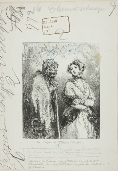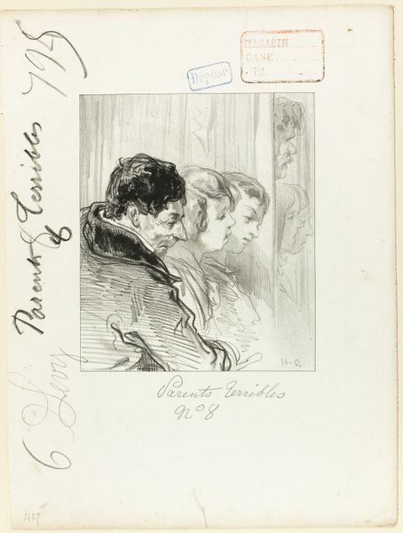 Paul Gavarni created "Les-Parents-Terribles series: Yes, but you will see the captain..." using graphite and grey wash on paper. The artwork captures a moment of intense, almost claustrophobic intimacy. Notice how Gavarni uses tight, close-up composition to focus on the figures; this heightens the emotional tension. The rapid, sketch-like quality of the lines adds to the sense of immediacy, as if we're eavesdropping on a private, fraught exchange. The stark contrast between the heavily shaded areas and the lighter tones emphasizes the dramatic undercurrent, pulling our eyes to the central figures. The visual weight of the father figure, looming and imposing, presses against the more delicate rendering of the daughter, creating a palpable sense of power and vulnerability. Gavarni masterfully uses these formal elements to explore themes of family dynamics, societal pressures, and perhaps even the unsettling realities of patriarchal control. The sketch operates as a semiotic space, where the interplay of light, shadow, and line communicate a narrative far beyond the literal. The use of chiaroscuro becomes a tool to destabilize comfortable meanings, challenging the viewer to look deeper into the layers of psychological tension at play. The stark lines and shaded forms become a powerful commentary on social structures and interpersonal relationships.