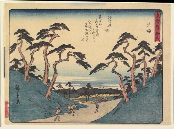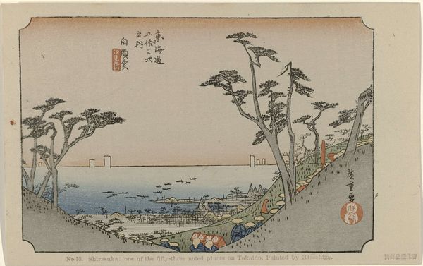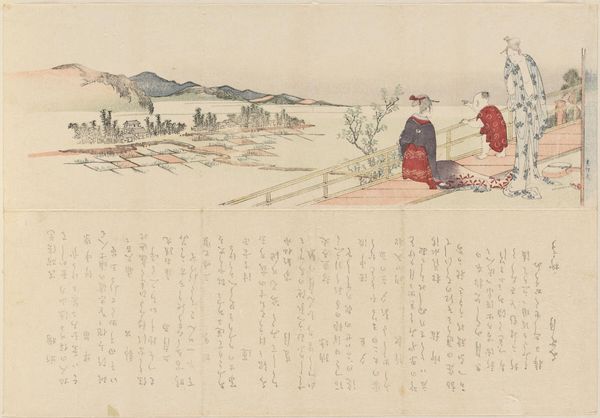 Editor: Hokusai’s “Iris Garden,” a woodblock print from the 19th century. I find this piece incredibly serene, almost dreamlike. The figures feel delicately placed within the landscape. What initially strikes you when you look at this, as a seasoned art enthusiast? Curator: You know, "dreamlike" is a perfect word. For me, it's all about how Hokusai balances stillness with suggestion. The composition—those figures in their finery against the simple bridge, the turtle heading straight towards a rooftop like he owns the place—it teases a story. Editor: A story? Tell me more! Curator: It feels almost like a haiku – capturing a fleeting moment, hinting at the mundane but finding poetry within. Are they going somewhere? Are they coming from somewhere? What’s turtle is rushing to? He plants all these possibilities into the visual space. Editor: So, the piece relies less on literal storytelling and more on evoking a feeling, and the details contribute to that? Curator: Precisely. Hokusai’s skill is in conjuring an entire world with only a handful of lines and carefully considered details. Take the color, so restrained and muted. Does it not echo a nostalgia, like gazing through the hazy recollections of a sweet moment? What do you make of those slender irises jutting out the landcape? Editor: They create a rhythm! Leading the eye across the scene, but also framing the characters walking away in an interesting fashion. It gives perspective… something is ending, maybe. I suppose they aren’t static plants but full of symbolic representation as well! Curator: Yes, in fact it mirrors how art helps us perceive and shape our reality. Looking closer allows our stories and our imaginations to blend in unison with our past and current understanding. It is, after all, what great art allows us to achieve. Editor: This conversation certainly changed how I will approach a print now, with this greater lens into cultural representation! Curator: Wonderful, isn’t it? To realize how one image, made so long ago, still sparks contemplation in the present moment!