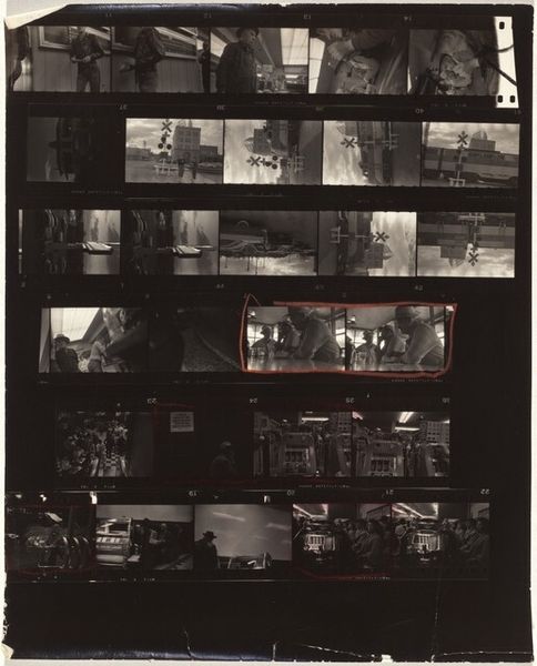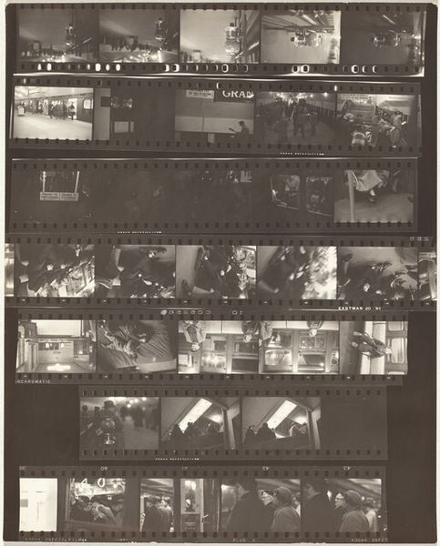 Editor: We’re looking at "Horse show opening 3," a gelatin-silver print made in 1954 by Robert Frank. It’s a strip of film, a sequence of black and white images, all these little moments captured. It feels almost like a memory reel, a bit grainy and… nostalgic, I guess? What do you see when you look at it? Curator: Ah, yes, Frank. He wasn't just pointing and shooting; he was channeling something… visceral. It's like a visual poem, fragments strung together. You get this sense of fleeting moments, the energy of a crowd, almost as if you can hear the chatter and feel the buzz of excitement. He’s not just documenting a horse show, is he? More like exploring the texture of American life itself. Tell me, what’s the dominant feeling it evokes? Editor: For me, it's a little disorienting, but in a good way? The Budweiser signs pop out, which is interesting, but the people feel very… normal. I’m curious why Frank chose to present it this way, as a film strip. Curator: He’s letting us in on his process, isn’t he? He’s saying, “Look, this isn't a polished, perfect image. This is how I see, how I experience.” That raw, almost unedited quality is precisely what gives it its power, its authenticity. I mean, think of it – no cropping, no staged perfection, just life as it unfolds, warts and all. It challenges the slick imagery that saturated media back then. It makes you question. Editor: That's true, it does feel like he’s challenging a certain kind of… curated reality. I didn't think of that before. Curator: Exactly! He's making us active viewers, encouraging us to assemble our own narrative from the fragments. Now, that, my dear, is the power of great art: to make you think, feel, and see differently. What a genius. Editor: It makes me want to go out and shoot some film myself! This was illuminating; I really appreciate your perspective. Curator: Likewise! Frank always has more to teach us, doesn't he? A true mirror to the soul.