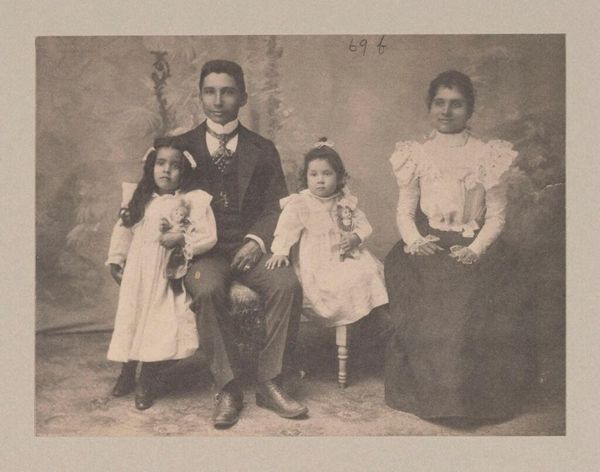 Editor: We're looking at "Portrait of a Man, a Woman, and Three Children" by Koene & Büttinghausen, created between 1894 and 1907. It’s a photograph housed in the Rijksmuseum. I’m immediately struck by how formal and almost austere it feels, even for a late 19th-century family portrait. What do you make of it? Curator: This photograph offers a glimpse into the social conventions and representational strategies of the period. Family portraits, particularly those created by studios like Koene & Büttinghausen, played a significant role in shaping middle-class identity. Consider the formality of the attire and posing, which reflect a desire for social respectability. Notice the mother's ornate dress, contrasted against the simplicity of the children's clothes, which speak to social expectations about decorum, especially for women. Editor: So, it's not just a picture but a carefully constructed image designed to convey a certain status? How do museums like the Rijksmuseum contribute to these kinds of constructed notions? Curator: Exactly. Museums don't just passively display objects. Their decisions about which works to collect, how to display them, and the stories they tell about them actively shape our understanding of the past. Showing images like these allows us to deconstruct assumptions we may have, and examine how families wanted to be perceived during the late 19th century. Who had access to such imagery and who did not is vital. This contributes to the politics of imagery. What do you notice about how they're staged in relation to the background? Editor: The stark background emphasizes their placement and almost presents them as if on a stage. I hadn't considered how staged it all might be, it does raise questions about authenticity and the curated image of the family itself. Curator: Indeed. Recognizing that every visual element here signifies choices makes you understand that viewing a historical portrait is more than seeing likeness; it's decoding constructed ideologies. Editor: I never thought about the museum being a curator, in essence, deciding the merit of objects in a grand scheme of culture and history. It has provided an enriching lesson on visual elements as well as what the Rijksmuseum communicates through its exhibits.