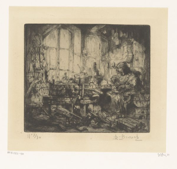 Editor: We’re looking at “Rotslandschap,” or “Rock Landscape,” a 1970 etching by Dirkje Kuik. It’s a monochrome print, and it strikes me as quite desolate, almost post-apocalyptic. What do you see in this piece? Curator: It’s fascinating, isn't it? I see a critique of industrialization and its impact on the environment. The monochrome palette amplifies the sense of ruin, the barrenness. Consider the date, 1970. What social and political movements were gaining momentum then? Editor: Environmental activism, definitely, along with second-wave feminism. Curator: Exactly. Kuik, as a woman artist working in a male-dominated field, may be using this landscape to comment on the destructive forces of patriarchy and unchecked capitalism. Do you see any elements that could represent resilience or resistance? Editor: Perhaps the suggestion of architectural ruins on the left – a reminder of what once stood, hinting at potential for rebuilding? Also, is that an eclipsed sun behind the jagged forms? Curator: Good observations. That eclipsed sun could symbolize a disrupted natural order, a world out of balance. It challenges us to consider our role in this destruction and the possibilities for restoration. The inclusion of architectural ruins prompts thoughts about coloniality too. Where is it really, this so-called landscape? Is it Europe? Somewhere the Europeean gaze falls upon? Is it post-something? This work could speak to the devastation caused by colonialism's environmental impacts. How can this be interpreted today, reflecting on intersectional issues? Editor: It’s powerful how this seemingly simple landscape can evoke so many layers of meaning. I hadn’t considered the colonial element or the feminist perspective before. Curator: It’s precisely this intersectional reading that allows us to connect art history with contemporary social and political dialogues. What did you learn today? Editor: To broaden my scope. Looking at the piece not just as a landscape, but as a statement about the interconnectedness of social justice and ecological awareness. Thanks.