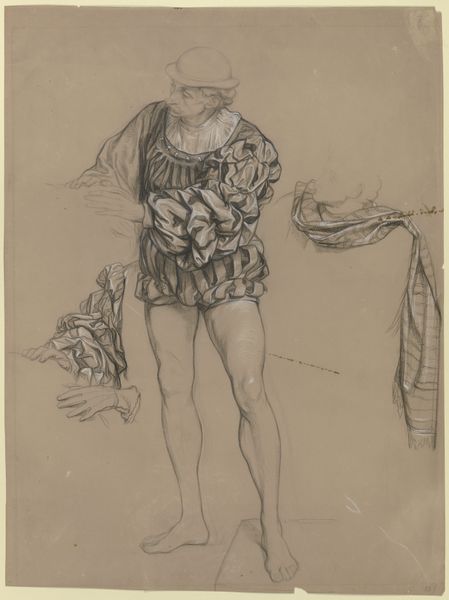Editor: This is "Studies of Armour" by Peter Hansen, sometime between 1914 and 1918. It looks like a watercolour and drawing combination, held at the SMK in Copenhagen. There’s something quite vulnerable about these sketches, even though armour is meant to protect. What do you see in this work, that stands out to you? Curator: What strikes me is how Hansen, using these traditionally 'lower' mediums of watercolour and drawing, elevates the object. We often see armour fetishized, celebrated for its craftsmanship within elite circles. Here, the focus seems to be on the labour embedded within. Consider the historical context - the beginning of total war – juxtaposed against traditional martial prowess. Editor: So you’re saying the artist isn't focused on the romance of the armour? Curator: Exactly. He detaches it from the narrative of heroic battle. Think about the mines providing the metal, the foundries, the repetitive work of assembly, and even the tailoring of the undergarments - a vast, complex system of labour condensed into this single suit. Does the application of watercolour on paper, itself a manufactured item, suggest a fragility that comments on industrialization, or even mortality? Editor: It's interesting that he chose to show the back view, too, focusing on construction more than presentation. Like, how it was assembled and worn? Curator: Precisely. The materials, the process...everything speaks to production and, potentially, the coming obsolescence of this kind of armour in the face of industrialized warfare. The very act of drawing, a form of labor, is highlighting the materiality and work that went into it's making. Editor: I’d never considered armour this way. Thanks, that definitely reframes it. Curator: Indeed, focusing on material and method provides new perspectives on even familiar objects.