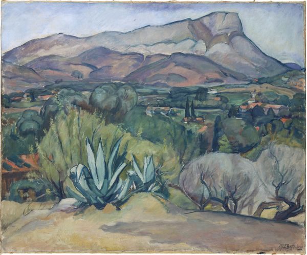 Editor: We’re looking at Nicholas Roerich's "Red Mountain. Santa Fe," painted in 1921 with oil paints. I'm really struck by the color palette—that intense reddish-orange of the mountain against the muted yellows and blues of the foreground. It feels almost… otherworldly. What do you see in this piece? Curator: It whispers of ancient tales to me. Roerich, a man deeply influenced by theosophy, wasn't just painting a mountain, was he? He was capturing an energy, a sense of place imbued with spiritual weight. Look how the mountain dominates the canvas, a fiery beacon against a more subdued horizon. I find myself wondering if this depiction reflects Roerich’s deep interest in symbolism and possibly hints at something more than landscape. What about that red – does that suggest a sort of simmering internal passion, or is it symbolic? Editor: Possibly, yes! I read that he traveled extensively in Central Asia. Does that background explain some of the spirituality you are describing? Curator: Absolutely. His journeys fundamentally shaped his artistic vision. Think about those vast landscapes, the remoteness, and the profound sense of history one must feel amidst such ancient formations. That's not a view you just pass by. Roerich channels all of that through his brush, giving the red mountain a symbolic punch. It's a memory. Editor: So it’s not just seeing, it’s remembering? It is about invoking more than just representing a space. Curator: Precisely. And Roerich does it so well here. Makes you want to pack your bags and get lost, doesn't it? Editor: It certainly does. It’s fascinating to consider how travel and personal beliefs influence an artist's perspective. I feel as if I’m seeing more than just pigment on canvas, I’m observing a soul imprinted onto it. Curator: Couldn’t have said it better myself! Now, off to the Himalayas, shall we? Figuratively, of course.