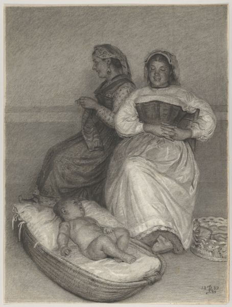 Curator: Here we have Honoré Daumier's lithograph from 1849, "Ah! il prétend m'empêcher d'aller...". Its full title, inscribed at the bottom, suggests something about preventing communion with comrades. Editor: It strikes me as a moment frozen mid-action—domestic turmoil perhaps? The lines are so dynamic, giving an immediate impression of vigorous struggle. Curator: Yes, consider Daumier’s rapid pen strokes, creating light and shadow. See how the artist guides our eye through compositional contrasts, with its dramatic figures dominating most of the pictorial space, expressing themes found in Romanticism, while simultaneously reflecting Realist artistic practices of representation in 19th century France. Editor: And what about the material context? Lithography, as a printmaking technique, allows for broader dissemination. I’m thinking of Daumier's use of it to connect with the working class. His work allows us a closer inspection of material distribution, its role as documentation, and medium to engage in social commentary. Curator: Precisely, Daumier aimed to critique the bourgeois, expose social injustices, and to examine the complex interplay of lines, shapes, and tonalities. Notice the careful positioning of figures within the architectural setting – and the interplay between each of the bodies displayed. Editor: It looks to me as though the materiality contributes significantly to this. You can clearly see the texture and the way the marks give a weight, almost a solidity, to their struggle that makes you think of social forces, labor, and the domestic roles represented. The print medium democratizes these tensions by capturing a conflict rooted in material conditions, labor, and social injustice. Curator: So we see an interplay between formal design and accessible social criticism. Editor: It speaks volumes on different levels!