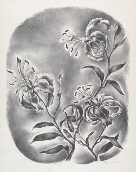 Curator: This is Jack Beal’s "Flowers," from around 1975, a compelling example of his drawings in printmaking mediums like etching and linocut. What's your immediate take on it? Editor: There's an ethereal quality here, wouldn’t you say? The light green background, coupled with those delicate line drawings—it evokes a sense of calm and gentle observation. Almost botanical, but more about line and form than true representation. Curator: Absolutely, the artist has been known to portray intimate scenes of American life. It reminds one of botanical illustrations produced during Victorian era—it almost hints back to those intricate scientific representations but rendered with a touch of modern, expressive simplicity. Do you think Beal was drawing on those historic, botanical illustrations as inspiration for his own drawing? Editor: Possibly, or perhaps responding to them? While Victorian studies sought meticulous detail, this print is more skeletal—it provides just enough information to identify the subject. See how those varied lines thicken and thin to emphasize edges? Beal’s reduced floral arrangement down to almost calligraphic gestures. Curator: Beal's use of linocut and etching for "Flowers" also fits a pattern in American art, doesn't it? During that period many artists used printmaking as a response against market constraints of paintings or sculptures—print became an affordable vehicle for democratizing art ownership among a broader middle class. It echoes ideas about the social accessibility and art democratization that resurfaced throughout the mid-20th century. Editor: Intriguing thought. Looking closely, it is also the use of blank space which does so much work here, providing as much information as the linear form itself. The texture within a field that allows visual and cerebral interpretation. The line becomes more dynamic and allows its relation to its background which creates the art. Curator: Considering Beal’s involvement in figurative painting during the time it seems that his commitment to capturing visible, relatable subjects would make the accessible media like print all the more important. And one also imagines that line work like we see in this print is important preparation for his oil work. It allowed the public more contact to him during his painting process. Editor: That rings true. Thinking about those delicate but assertive lines, that's precisely it: contact, the intimacy with form captured and displayed to engage public thought with botanical imagery and print media. Curator: It allows new perspectives on floral imagery in social discourse and art itself. Editor: Exactly, and its very presentation invites you closer—to see and maybe question those lines more profoundly.