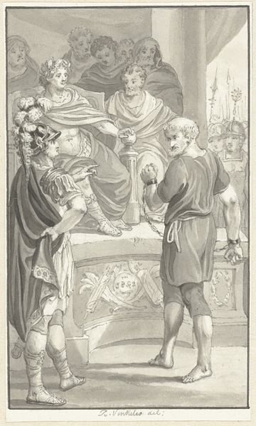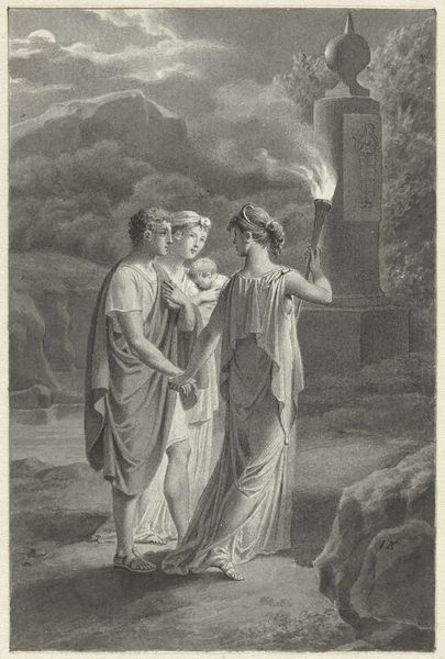 Will Hicock Low created the ink wash drawing, "As One Came Near with Curl'd Gray Beard, Sharp Eyes, and Smooth Bald Crown," likely during the late 19th century, a period when classical themes were often revisited to reflect contemporary ideals. The drawing depicts a tender, yet fraught moment between a young couple, observed by an older, scholarly figure. The scene evokes a sense of impending decision or transition, set against a backdrop that merges classical architecture with a celestial, star-filled sky. Low uses the classical setting not merely as historical decoration but as a stage upon which personal dramas of love, duty, and perhaps sacrifice unfold. The figures, draped in classical garb, invite us to consider how societal expectations and personal desires intersect. The woman’s gentle touch contrasts with the man’s veiled face, suggesting a conflict between emotional vulnerability and the need to conceal feelings, a theme still relevant today. The presence of the older man, with his books and discerning gaze, hints at the weight of tradition and judgment. This work encourages us to contemplate how love and identity are negotiated within the constraints of social norms and historical legacies, reflecting both the beauty and the burdens of the past.