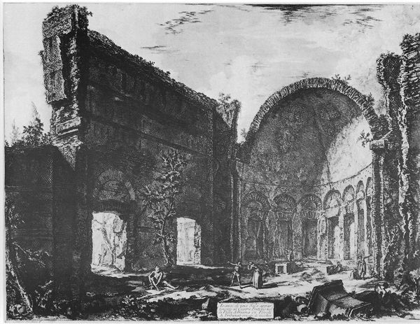 Giovanni Battista Piranesi made this etching, "Vedute di Roma," or "Views of Rome," at some point during his career in eighteenth-century Italy. Piranesi's Rome was a city of contrasts, where the grandeur of ancient ruins stood side-by-side with the bustling life of the modern city. This image shows the interior of a ruined building, possibly a temple or bathhouse, with its massive dome and crumbling walls. Tiny figures work among the ruins, giving a sense of scale and highlighting the contrast between the ancient past and the present. Piranesi was not just documenting the city; he was also commenting on the social structures of his time. Rome, once the center of a vast empire, was now a city struggling to maintain its former glory. Piranesi's etchings reflect this tension, capturing both the beauty and the decay of the city. The historian consults guidebooks, archives, and archeological reports to understand Piranesi's Rome and how it reflected the social and institutional context of eighteenth-century Italy. Art always relies on that wider context.
