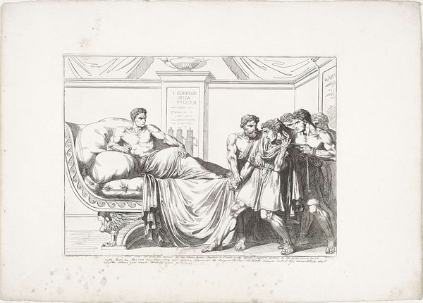 Curator: The artwork we’re observing here, residing at the Rijksmuseum, is an engraving from 1833 entitled “Huwelijk tussen Apollo en een jonge dame,” or "Marriage between Apollo and a young lady," created by Daniël (I) Veelwaard. Editor: Well, my immediate reaction is that it's staged, and slightly absurd. Apollo looks stiff, the bride seems rather bland, and that character to the left has such a grotesque profile, so unlike classical figures. It gives a slightly satirical impression. Curator: I find that's precisely the point. Veelwaard operated within a neoclassical context but wasn’t beyond injecting social commentary through the art. While classical subjects gained traction and lent themselves to the aesthetic, it was frequently appropriated for political or social purposes. Notice the engraver, officiating the contract, represents, perhaps, not the purity of love, but the transactional and controlled aspects of marriage? Editor: True, but Apollo looks less like a radiant god of poetry and light, and more like a stage actor awkwardly holding a prop bow. He is there just to provide the classical touch, while the image says something else about control of love through legal agreements and the social role it represents for men and women. What about her apparent lack of excitement about this union with a god? Her eyes and pose show sadness more than happiness. Curator: Indeed, and if you examine other artworks from this time period that feature marriages or unions, especially of notable figures, you might find they exhibit a specific degree of staged-ness and emotional remove. Public art had a civic duty: so to show personal, complex emotion perhaps flew in the face of creating acceptable public image. The woman looks unhappy in the presence of a smiling man which serves as contrast between legal rights versus the lack of emotion. Editor: I see that. Knowing more about its creation during that historical period definitely sheds a new light on the artwork. While on first view I see caricature and bad acting, a closer look at its context does illuminate themes of control, contracts and a questioning about the roles involved. The artist's decision to use engraving to recreate an otherwise classical representation of Apollos reinforces, to me, those statements of institutional control. Curator: It's those very societal influences—political undertones embedded within classical idealism—that keep "Huwelijk tussen Apollo en een jonge dame" a compelling case study, I think, for art and its public role. Editor: And it reminds me of how important it is to look beyond surface representations, in any art piece. Thanks for walking me through this one!