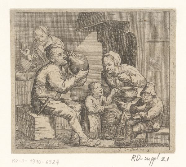 Editor: This etching, "Scene in an Inn" by Jacques Dassonville, created sometime between 1629 and 1670, gives such a vivid impression of daily life. The composition feels almost claustrophobic, packed with figures. What stands out to you? Curator: The symbols here speak volumes about societal values. Notice the way the figures huddle together. What do you think that says about the community's perception of comfort and security? Editor: It definitely feels like they are seeking companionship, especially in what appears to be a boisterous, almost chaotic environment. Is that typical of genre scenes from this period? Curator: Precisely. It goes deeper. Consider the pipes and drinking vessels. These were not merely props; they were imbued with connotations of leisure, social status, sometimes even moral laxity. Their presence here speaks to a certain accepted culture of relaxation. How might those items have been perceived at the time versus now? Editor: Interesting. Today we might see it simply as people enjoying themselves, but then it could be interpreted with more judgment, maybe even as commentary on social behavior. Are the children doing anything symbolic? Curator: They could hint at inherited destinies, caught within the social environment that dictates a certain mode of existence. Editor: That's powerful. So, by studying these details, we are actually decoding a complex cultural narrative hidden within an everyday scene? Curator: Exactly! It’s a reminder that art is so much more than what initially meets the eye. It’s cultural memory etched in visual form. Editor: This makes me look at genre paintings in a completely different light. Thank you for highlighting these cultural nuances; it's definitely changed my perspective.