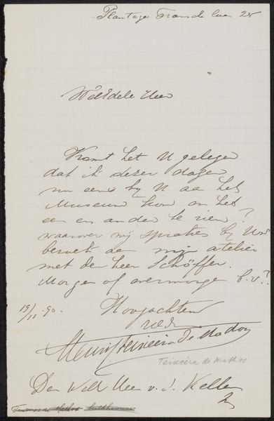 Curator: Here we have Germaine Wenziner’s “Brief aan Henriette Wilhelmina van Baak,” possibly from 1914, executed in ink on paper. Editor: My immediate impression is one of intimacy. The delicate, almost fragile strokes of the ink, the off-white paper...it speaks of secrets shared and heartfelt communication. Curator: The materiality contributes significantly to the artwork's reading. The specific choice of ink impacts not just the contrast with the paper but also the perceived weight and rhythm of the lines. Its formal construction—the rise and fall of each stroke—evokes a sonic quality almost. Editor: Absolutely. Beyond the line quality, the very act of handwriting is imbued with meaning here. Each loop and flourish feels deliberate, laden with cultural expectation, like the ritualistic correspondence between ladies. Do we know if the recipient of this letter had some iconic cultural import? Curator: In terms of its representational value, one might decode elements from graphology to try to characterize the author based on her unique writing. Her line pressure and formations might unveil facets of the unconscious. I, for one, am drawn to the spatial relation between words on the page – what could those gaps and deliberate placements mean? Editor: Graphology is a fantastic lens. Beyond the purely formal, I wonder what it says about turn-of-the-century social norms in Europe. Letter-writing itself could be interpreted as symbolic gesture—a potent expression of affection, status, even power. Curator: Perhaps. But I am keen to keep analyzing the curves and lines themselves, appreciating them divorced from possible cultural intent or social meanings. Editor: Still, looking beyond the letterforms alone, this feels heavy with social and historic context. It gives one a certain wistful feeling towards the bygone era. Curator: Agreed; however we read its many layers, the interplay between line and space, message and form, lingers in the eye. Editor: Indeed, like a phantom limb or echo, carrying forward the quiet urgency of that particular moment.