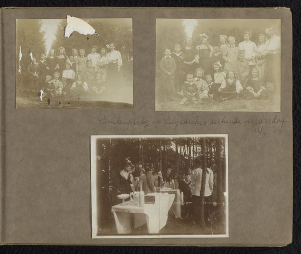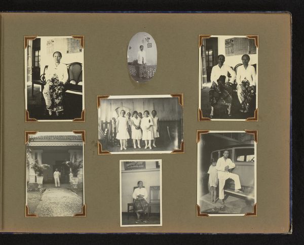 This is an anonymous photo album page titled "Feestavond" at the Rijksmuseum. The structure is immediately apparent: five rectangular photographs arranged asymmetrically on a dark background. The varying orientations of the photographs, some vertical, others horizontal, introduce a dynamic tension within the static frame of the album page. Each photograph acts as a window into the collective social life of the military. The composition in each image is densely packed, creating a sense of communal activity. The framing is intimate, capturing moments of camaraderie and perhaps even a shared sense of displacement. The play of light and shadow, though subtle in the monochromatic palette, helps to define the forms and add depth to the otherwise flat photographic surface. These photographic records challenge fixed notions of wartime experience, revealing the social interactions that define community amidst conflict. Ultimately, "Feestavond" invites us to consider how meaning is constructed through the juxtaposition of form and content, presenting a multilayered narrative within a seemingly simple arrangement.
