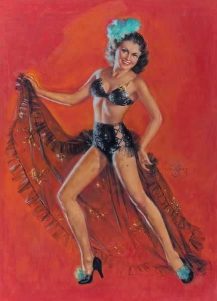 Editor: Gil Elvgren's "I Must Be Going To Waist," painted in 1946 using oil paints, depicts a woman struggling with a garment. It feels playful, and a bit cheeky, I suppose, but what jumps out at me is the obvious attention given to details, and this fantastic light that gives it an interesting mood. What do you see in this piece, beyond the obvious pin-up aesthetic? Curator: Oh, it's so much more than just a pin-up, isn't it? Elvgren was a master of capturing a specific moment, an implied narrative. It's the "oops, caught in the act" that grabs the viewer, a wink and a nudge, you know? Think about the post-war era—the optimism, the burgeoning consumer culture. He's selling a fantasy, sure, but also tapping into a real sense of desire and humor. Do you notice how the light focuses almost exclusively on her? It really emphasizes her femininity. Editor: Absolutely, it's strategic, for sure. And the implied story, as you call it…it works, definitely! Curator: Right! The skill is deceptive, really. Academic art informed his painting – and he was very good at what he did. But there’s something almost self-aware about his works… Almost poking fun at that same consumerist desire he feeds. What do you make of that present sitting next to her? Editor: A gift. Definitely a romantic gesture to impress a partner. It’s a nice complement to her attire – very telling, the whole setup, actually. I can also see how one could make it darker with, you know, like, objectification and such. Curator: Yes, well, art often holds a mirror to society, reflecting both its beauty and its flaws. It’s all in the viewer’s eye and what they see or want to see! I guess you have a point, and I never considered that. Thank you for this moment of awareness. Editor: Thanks, it was insightful to see how different art periods influenced even works like this.