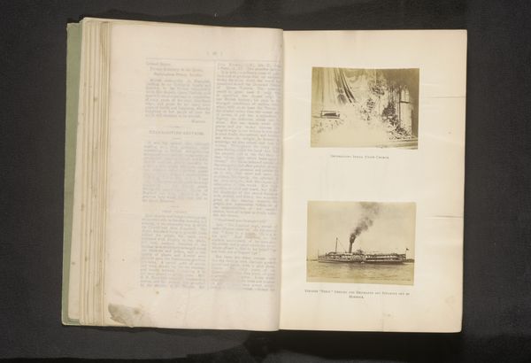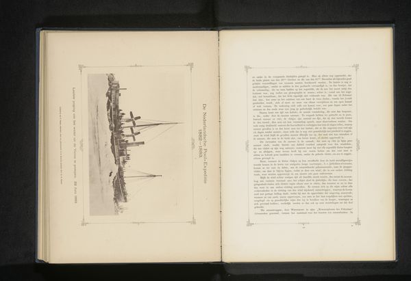 Editor: Here we have "Gezicht op de Dymphna en de Varna in de Karazee," or "View of the Dymphna and the Varna in the Kara Sea", made before 1886, by H. Ekama. It appears to be a print of a photograph, placed within the pages of a book or journal. The monochromatic image creates a somber, reflective mood. Curator, what strikes you about the visual construction of this image? Curator: Note how the composition relies heavily on line – the rigging of the ships, the implied horizon – creating a skeletal framework. The tonal range is quite narrow, pushing the eye to discern subtleties in the interplay of light and shadow, essentially rendering form almost abstractly. This narrow range highlights the textures of the paper and the print itself. Are you drawn to the flatness of the image, a result of both the photographic process of the time, and the printing limitations, or do you perceive depth despite this? Editor: I notice the flatness, but the angle of the ships creates a sense of receding into the distance. Is the book context essential to its reading or could the print stand alone as a work? Curator: The framing within the book, with the facing page of text, establishes a clear visual dichotomy, wouldn’t you agree? There is a calculated juxtaposition between the literal language and the pictorial language, an interesting reflection on documentary practices of the era. The materiality of the aged paper is integral as well; it communicates a passage of time that deepens the artwork's reflective quality. Editor: I see what you mean, the framing enhances the impact. I didn’t consider the significance of the book format and the aging of the materials before. Thanks for pointing that out!