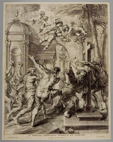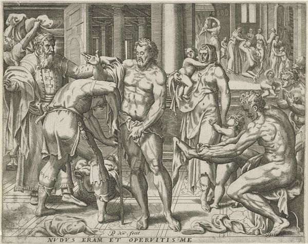 Curator: This is Pietro Aquila’s "Xenophon's Sacrifice after the Chase," an undated engraving from the Harvard Art Museums. It’s a rather busy scene. Editor: My first thought? Organized chaos. There's a lot happening, but it feels like a carefully choreographed dance, everyone in their designated spot. Curator: Look at the temple in the background. The Doric columns frame the figures, rooting the scene in classical ideals. And the figures themselves... Xenophon, the leader, orchestrates this sacrifice, a thanksgiving for their safe return. Editor: Sacrifice, right. It's primal, this act of giving back. And I love the little cherubs peeking in from the left, almost like curious bystanders. It reminds me how these rituals connect us to something ancient, something bigger than ourselves. Curator: Indeed. Sacrifice and gratitude are universal concepts, made tangible through symbols of faith and community. This scene reminds us of the power of shared rituals. Editor: And it makes you think, doesn’t it? What do we sacrifice today? What are our rituals of thanks?