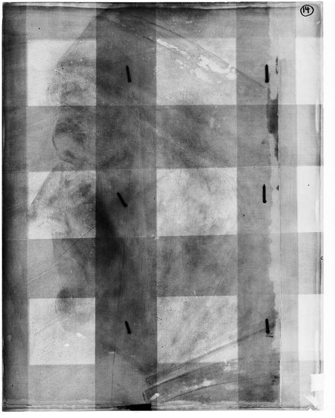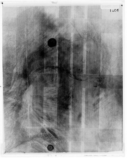 Editor: So, this is an x-radiograph of a copy of Hans Holbein the Younger's "Lady Guilford." The film is 14 x 17. It's eerie! Like peering at a ghost. What hidden stories do you see in this ghostly image? Curator: Well, it's like glimpsing the painting's soul, isn't it? The x-ray reveals the artist's process, the density of the paint, the underlayers... imagine Holbein, meticulously building this portrait. This copy, seen through the x-ray, becomes a conversation across time, a shadow dance. Don't you feel that? Editor: Absolutely! It's like the painting is whispering secrets about art history. I never thought an x-ray could be so poetic. Curator: Exactly! Art is about seeing beyond the surface, isn't it? It is a dialogue and a dance.