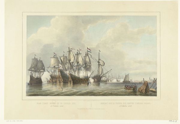 Editor: So, this is “Zeeslag bij Doggersbank, 1781,” or the Battle of Dogger Bank, 1781, by Robbert Muys, an etching from 1784. There's such incredible detail in the ships and the smoky haze of battle; it definitely feels like an intense moment captured. What symbols or visual cues do you see embedded within this scene? Curator: Notice how the flags serve not just as identifiers, but also as potent symbols of national pride and naval strength. They carry the weight of political ambitions and trade rivalries of the time. What emotional responses do you think Muys aimed to evoke by foregrounding these flags amidst the chaos of battle? Editor: That's interesting. I hadn't really considered the flags beyond their literal meaning. It feels like they're meant to instill both fear in the enemy and courage in their own crew. Do you see any other symbols used by Muys? Curator: Consider the positioning of the ships, especially those engaged in direct conflict. Does the arrangement convey a particular narrative or strategic advantage? And think about the light—how does the illumination (or lack thereof, given the smoke) play into creating an emotional response? Does it speak to ideals of heroism, or a sense of loss? Editor: It definitely amplifies the drama, with those flashes of light emphasizing certain ships and obscuring others. It's like a play of visibility and concealment that adds to the uncertainty of war. Looking closely, what would you say the iconography conveys about broader 18th-century maritime culture? Curator: The Dogger Bank battle becomes a microcosm. It reflects the larger power dynamics unfolding across the seas at that time, especially naval dominance as crucial for economic and political control. So how does Muys use the imagery to tell a story, not just of a single battle, but of a shifting world order? Editor: I see how this etching, beyond depicting a historical event, embodies the era's anxieties and ambitions surrounding naval power. It’s amazing how much cultural information is embedded within a single image!
