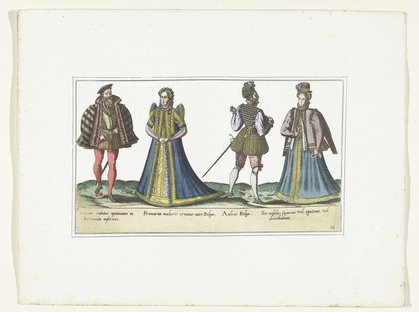 Curator: It's hard to miss the sheer variety of textures in this piece; everything from the woolens to silks seems painstakingly rendered. We’re looking at “Drie vrouwen en een man gekleed volgens de Duitse mode, ca. 1580,” made sometime between 1872 and 1875. It is currently held in the collection of the Rijksmuseum. Editor: They certainly have a stoic elegance about them, almost doll-like in their stillness. Is this a commentary on the rigidity of social roles in 16th century Germany, perhaps? Curator: Possibly. Let’s remember this work is likely an engraving. Note the fineness of the lines and how much information is conveyed. There is an anonymous hand creating a document meant to serve some purpose – likely to circulate ideas of class. These fabrics and their tailoring involved substantial labor. We are considering who benefits from these material choices. Editor: Precisely! Think of the sumptuary laws of the time – what you wore broadcasted your status and controlled access to resources and social mobility. Even something as simple as the length of a train or the type of fabric was heavily regulated. One needs to examine how it all contributes to maintaining gendered, patriarchal societal hierarchies. Curator: You know, what strikes me is the seeming artifice of it all. This engraving attempts to freeze these figures in time, solidifying the aspirational possibilities through accessing consumer goods, but we know it's just a snapshot and a controlled presentation, not an honest one. What power does owning one's image convey? And more specifically, owning an idealized image? Editor: It is interesting to me that the artist, while anonymous, chose to depict not just the nobility, but specific signifiers of the burgeoning merchant class through access to high quality textiles and expert construction, indicating a shifting power dynamic, potentially highlighting growing social mobility... or perhaps satirizing it. The composition suggests something of an allegory—a silent drama frozen in print. Curator: Right. It’s interesting to consider what this piece lacks—namely, individual likeness. We see types of figures represented; not actual, recognizable people. Editor: It reminds us that art doesn't exist in a vacuum; these fashion plates reflected and reinforced societal norms while potentially questioning or subverting expectations. They speak to an ongoing power play. Curator: So true. These sartorial choices—they are all deliberate choices made on the parts of the maker, the wearers and their place in economy. Thank you for making me see the significance of its broader social context, Editor. Editor: Thank you, Curator, for shining a light on the details of craftsmanship and production. Together, these details show the broader implications of the portrait we find so intriguing.
