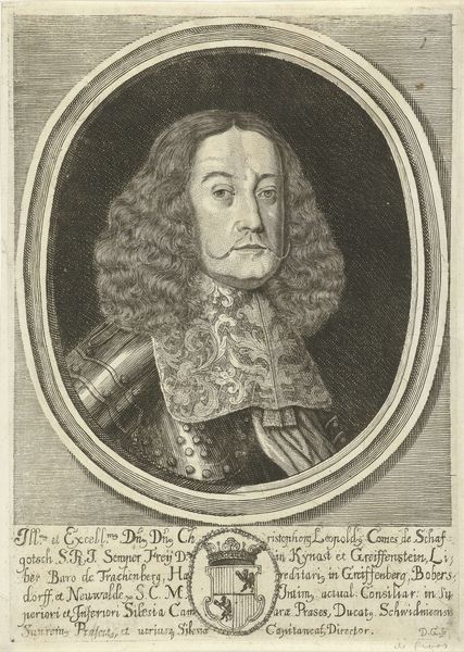 Jacob Gole created this portrait of Charles I, Landgrave of Hesse-Kassel, sometime around 1700 using engraving techniques. The portrait, encased within an oval frame, immediately draws us in with its play of textures. Gole masterfully uses line and shading to distinguish between the smooth polish of the armor and the softness of the fur trim, creating a rich tactile experience. The subject, Charles I, is presented in a way that merges his personal identity with his status. Consider how the oval border isn't just a frame. Instead, it functions as a semiotic device, filled with symbols and inscriptions that speak to his lineage and authority, reinforcing a sense of historical narrative. Through this lens, Gole’s work is a visual encoding of power. It uses formal elements to reflect and propagate specific cultural values and dynastic claims.