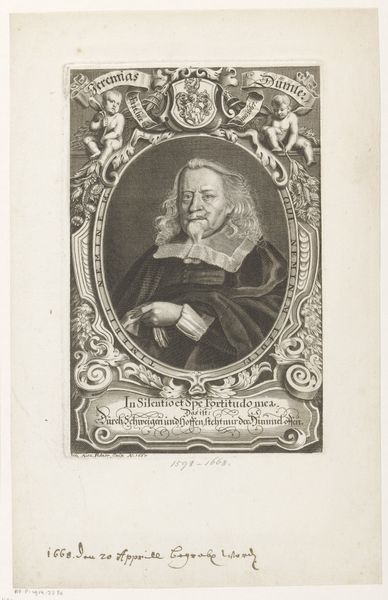 Johann Adam Seupel made this print of Emanuel Socinus, likely sometime around 1688, the year mentioned in the inscription. This portrait embodies the visual codes of status and authority prevalent in the Dutch Golden Age. Note the intricate details of Socinus's attire, the elaborate wig, and the laurel wreath. These elements convey his nobility and importance within society. The Latin inscription further emphasizes his virtues and role as a counselor and father of the fatherland. Prints like these played a crucial role in disseminating images of important figures, shaping public perception, and reinforcing social hierarchies. They weren't just about likeness, but also about conveying power and legitimacy. To understand the full significance of this work, we would need to delve into the specific social and political context of 17th-century Basel, Switzerland. Researching the Socinus family and their role in the city's governance would offer valuable insights into the meaning of this portrait.