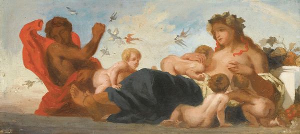 Curator: Welcome. Before us, we have Adam Elsheimer’s captivating oil painting, "A Witch with Cupids," created around 1598. Editor: My initial reaction? It's unsettling. The dark palette combined with the unsettling depiction of the witch creates a tense, almost suffocating atmosphere. The cupids seem to be suffering, too; this isn't your typical Renaissance scene of love and harmony! Curator: Elsheimer was working at the intersection of mannerism and the burgeoning Baroque style. It’s fascinating to observe how traditional mythological subjects were reinterpreted, moving from idealized forms to portrayals with psychological depth and even a touch of the grotesque. Editor: I agree, and that subversion is exactly what captures my attention. This feels like a powerful statement about the darker sides of desire and power, symbolized, maybe, by a woman not bound by patriarchal restrictions—branded as "witch." What might be happening to the children, and who would depict that for the public's consumption? Curator: These images circulated in elite circles. The allegory is rooted in classical mythology, referencing Circe and her ability to transform men with potions, which the witch clearly still does. The cupids may show the perversions or the negative influences of love. Editor: Right, because, of course, attributing negativity to uncontrolled female influence makes so much sense given the prevalent historical biases of art. So, this "grotesque" woman challenges those very constraints. Elsheimer probably just intended it as a fantastical story but he created space for discussions about forbidden knowledge, marginalized figures, and the dangers ascribed to female autonomy. Curator: It is thought-provoking to examine its cultural implications within a historical framework that either condemns female figures to caricatures or tries to erase women. Editor: I find this particular artwork especially powerful. It serves as a reminder to deconstruct ingrained perspectives. Curator: Indeed. A work that still evokes feelings of social change today. Editor: Absolutely. These complexities are important because they enable discourse. Curator: We hope you have found our different analyses insightful.