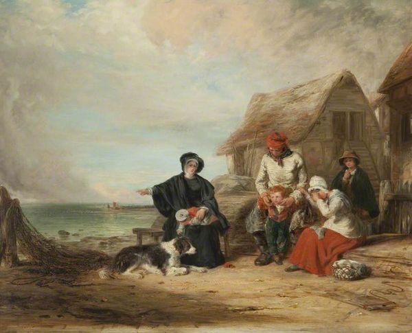 Editor: Here we have Thomas Jones Barker's "Landscape with Figures," an oil painting, although the exact date is unknown. There's a palpable sense of melancholic realism to it, particularly in the figures' somber appearance against the wild backdrop. How do you interpret this work? Curator: It strikes me as deeply embedded within the social consciousness of its time, perhaps reflecting on rural life and labor. Note the mother and child. Ask yourself: what societal conditions might have prompted Barker to portray these figures in this way? Are they romanticized or realistically presented, and what does that choice tell us about Barker's intentions and the expectations of his audience? Editor: I hadn't really thought about it that way, viewing it more simply as an observation of life. Curator: But "observation" itself is shaped by social and cultural frameworks. What did it mean to depict working-class figures at this period? Was it an act of social commentary, a celebration of rural life, or perhaps something else entirely? Think about the prevailing attitudes towards the poor and working classes at the time. The museum or gallery that eventually exhibited it would have influenced its reception, as well. Editor: So, the painting is not just a pretty scene, but potentially loaded with social and political implications. Curator: Exactly. And considering that these are possibly members of the working class, what public role did this imagery fulfill? Consider how its message would have been interpreted, depending on who was looking at it. The answer to these types of questions opens up our appreciation. Editor: This gives me so much to consider when I look at it next time. Thanks! Curator: It's crucial to consider these things. We, today, should examine what stories museums present through artworks and, just as importantly, whose stories remain untold.
