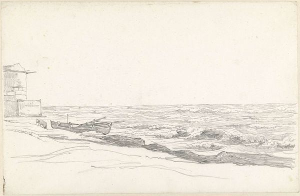 Chris Huidekooper rendered "Vissersboot voor de kust van Katwijk" in pencil, presenting a scene where the sea and sky meet in a seamless horizon. The composition is subtle: a fishing boat takes center stage, its form echoed by smaller vessels in the distance. Huidekooper's lines capture the essence of the maritime environment, yet the drawing’s power lies in its understated formalism. The minimalist lines and monochromatic palette create a sense of stillness, almost as if time is suspended. The light and shadow interplay across the water's surface adds depth. The artist masterfully uses a semiotic system of signs – the boat, a symbol of labor; the sea, a signifier of nature's power. These familiar images destabilize fixed meanings by presenting a serene, almost ethereal quality, challenging our expectations of the harsh realities of maritime life. The horizon line creates a visual field of ambiguity, where the boundaries between sea and sky blur. This fosters a contemplation on the transient nature of existence.